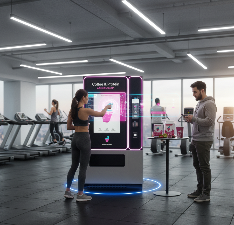 Capacidad de hasta 120 vasos y 12 tipos de insumos, incluyendo proteínas, café, y energéticos.